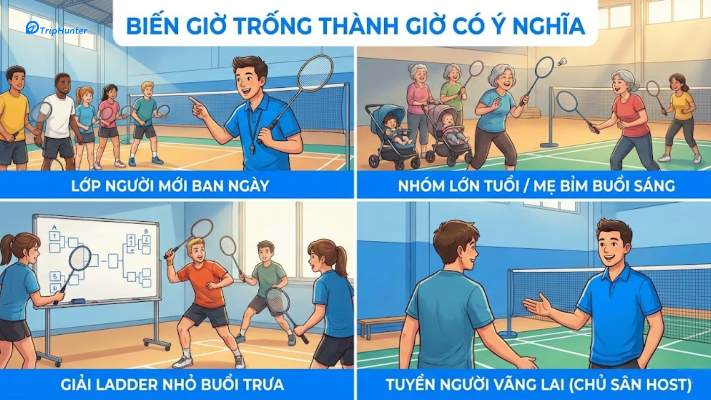 Khi con đi học hoặc khi người lớn tuổi rảnh buổi sáng, đây là nhóm khách rất phù hợp để lấp giờ thấp điểm. Khung thời gian này ở hầu hết sân thường bị bỏ trống nếu không khai thác bài bản.